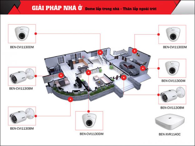 - Khu vực phòng khách, nhà để xe: sử dụng camera bán cầu, với thiết kế nhỏ gọn, góc nhìn rộng, phù hợp với điều kiện thẩm mĩ và không gian trong nhà.